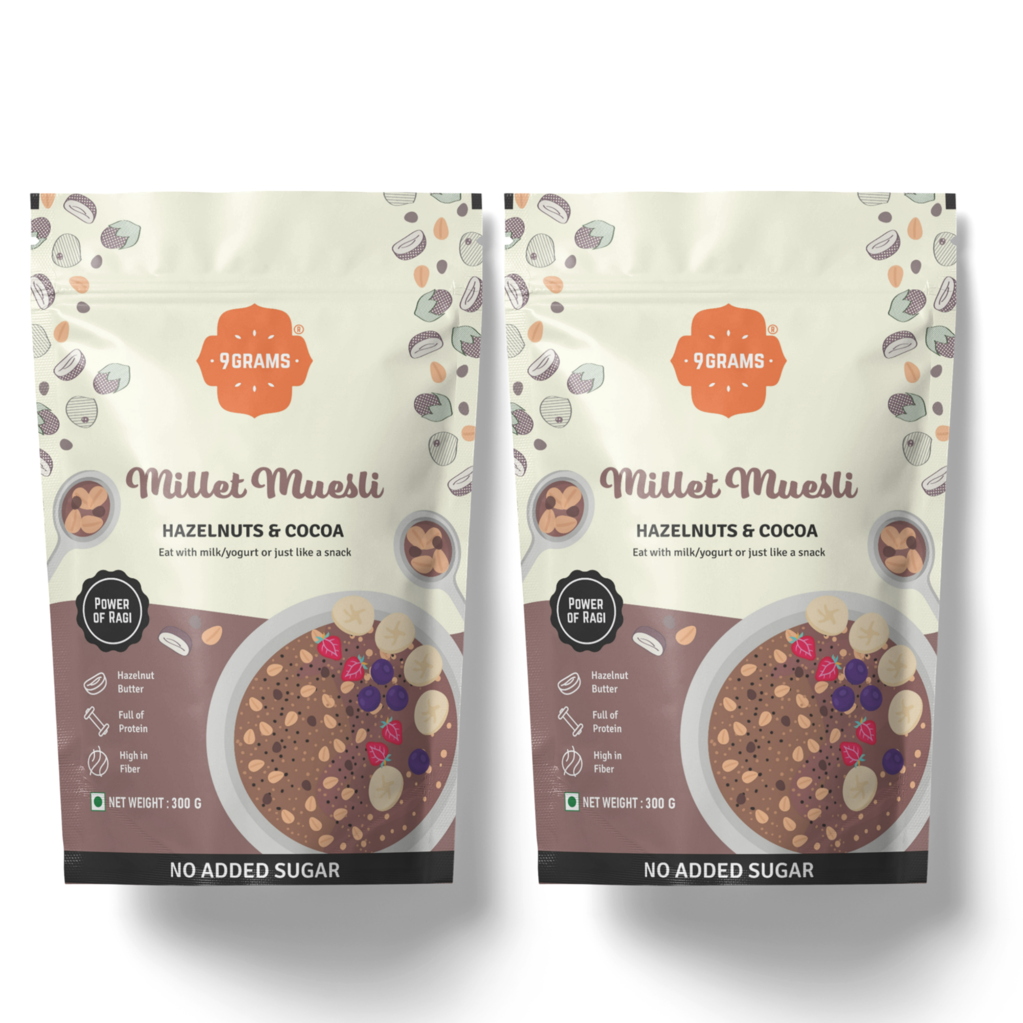 Millets and oats dipped in pure hazelnut butter. lightly baked & topped with black raisins, honey, hazelnuts and almonds. This is our clean take on traditional muesli.